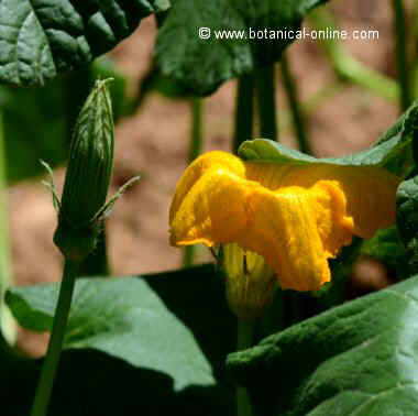 Cucurbita pepo L. – (Carabassa)Herba anual reptant de la família de les cucurbitàcies de fins a 10 m. de longitud. Tiges hirsutes, acanalats. Fulles cordades, lobulades. Flors unisexuals de fins a 10 cm. amb el calze unit a la corol·la; les masculines amb els estams soldats en columna. Fruit molt variable (carabassa o carbassó). Planta originària d’Amèrica Central i cultivada en molts llocs del món. |