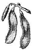 Ilustración de un brote de la planta, flor y frutos (vainas) de soja