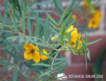 Photo of Senna artemisioides Yellow cassia: (Cassia siamea lam.) It is characterized by overhanging branches with inflorescences of yellow flowers. Coming from Southeast Asia, it is mainly used as a protection in areas subjected to heavy erosion in warm regions, because its ability to adapt to sandy soils and its rapid growth. Its tropical wood is prized for building poles. Because of its wide leaves, it is used as a tree which provides shade for coffee plantations. The abundance of flowers makes it valuable as a honey plant. It has been used as a laxative.
