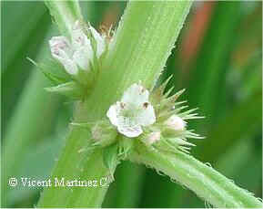 Lycopus europaeus L. – (Gypsywort)Perennial plant of the Mint family -labiatae- up to 1 m. Erect stems, usually single or not numerous, hairy. Ovate leaves, deep-toothed, but in the tip. white flowers till 3 mm., in dense whorls, surrounded by two conspicuous bracts. By the side of the streams or very humid places. |
